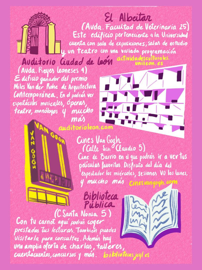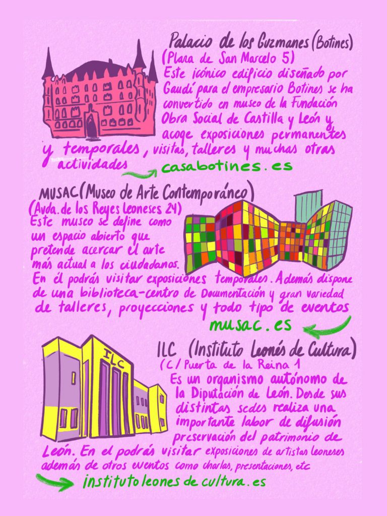 Incluimos, por ejemplo: bibliotecas, que muchas veces se nos olvidan pero ofrecen actividades, clubes de lectura y salas de estudio. Museos, como el MUSAC, el Museo de León, o el Instituto Leonés de Cultura, donde descubrimos exposiciones muy diferentes entre sí.