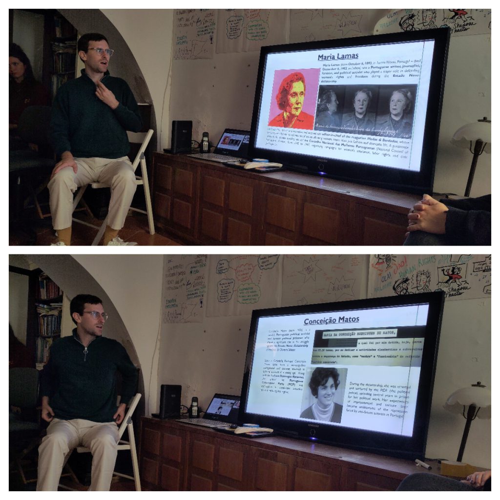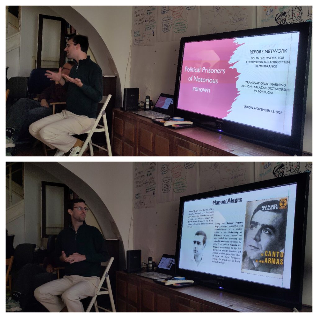 La última jornada sirvió para evaluar el trabajo realizado y presentar las acciones locales que cada organización está desarrollando en su comunidad: investigaciones sobre víctimas del totalitarismo, rutas educativas de memoria, talleres de historia democrática o proyectos audiovisuales. Se hizo un especial hincapié en las mujeres protagonistas en la lucha por la democracia en Portugal y en la persecución y represión política ejercida durante la dictadura de Salazar. Asimismo, se grabaron nuevos podcasts para la difusión del proyecto REFORE, en los que se sintetizaron los principales aprendizajes de la experiencia portuguesa.