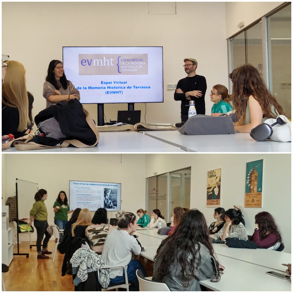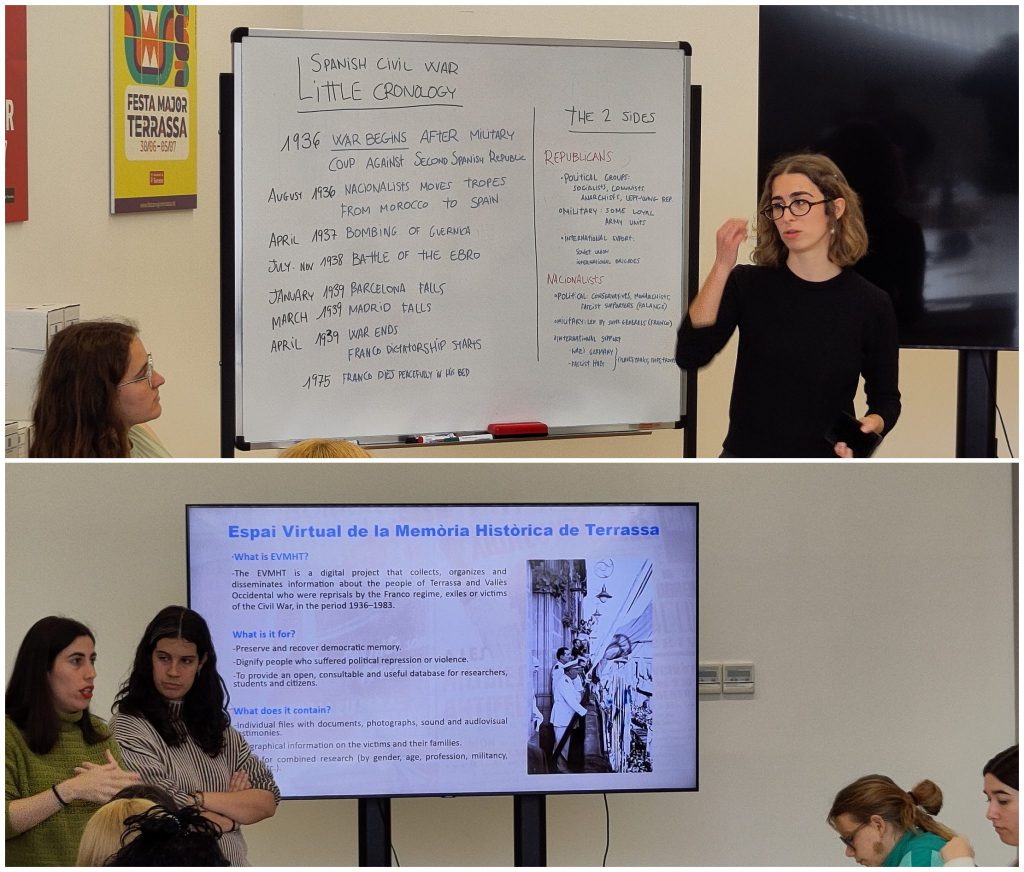 Posteriormente, se presentó el Espacio Virtual de Memoria Histórica de Terrassa (EVMHT), un recurso documental, educativo y de investigación que recoge información sobre la República, la Guerra Civil, el exilio, la dictadura y la Transición (1936–1983). Los y las participantes reflexionaron sobre cómo la historia local puede integrarse en una narrativa europea, poniendo en valor la memoria como instrumento de aprendizaje y prevención frente a la intolerancia y el autoritarismo.