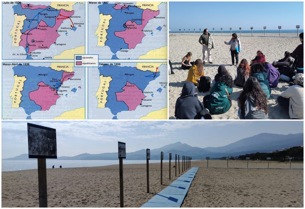 La cuarta jornada incluyó la visita al campo de concentración de Argelès-sur-Mer (Francia). Este espacio fue uno de los principales lugares de internamiento improvisados para las personas exiliadas en 1939. Se estudió cómo más de 200.000 personas fueron recluidas en condiciones precarias: sin barracones adecuados, expuestas al frío, con escasez de alimentos y enfermedades.